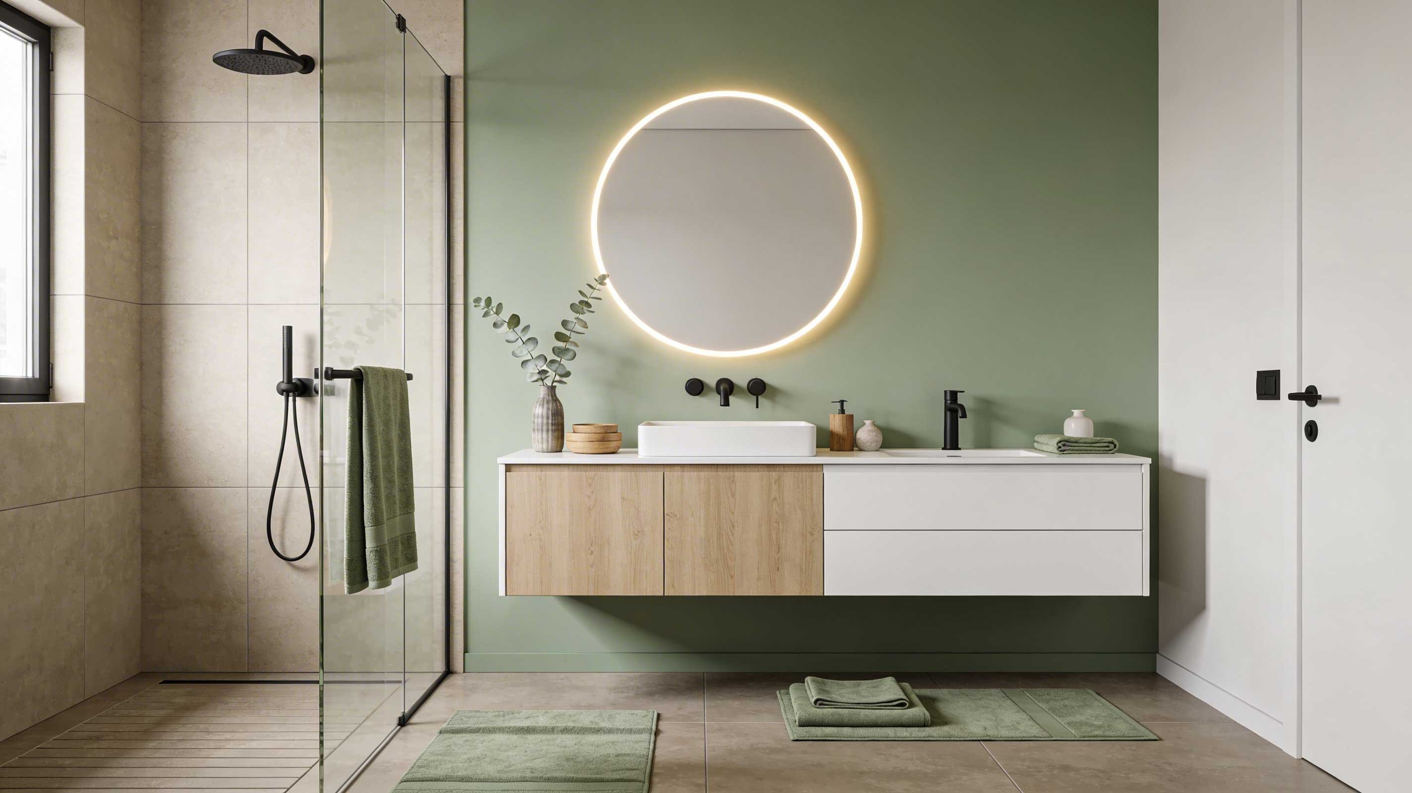 Damit der Look warm und wohnlich wirkt, solltest du salbeigrüne Flächen unbedingt mit Holz oder Holzoptik bei den Badmöbeln kombinieren, etwa in Form von Eiche oder heller Pinie. Fronten wirken in matt deutlich zeitgemäßer als in Hochglanz, und die samtige Oberfläche passt perfekt zu pudrigen Grüntönen. Helle Waschtische und Keramik in Weiß oder Elfenbein setzen einen ruhigen Gegenpol und verhindern, dass der Raum zu dunkel oder schwer wirkt. So entsteht ein ausgewogenes Zusammenspiel aus Farbe, Material und Form, das den Trendcharakter des Bades unterstreicht.